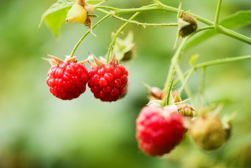 Natural fresh raspberries growing in farm
